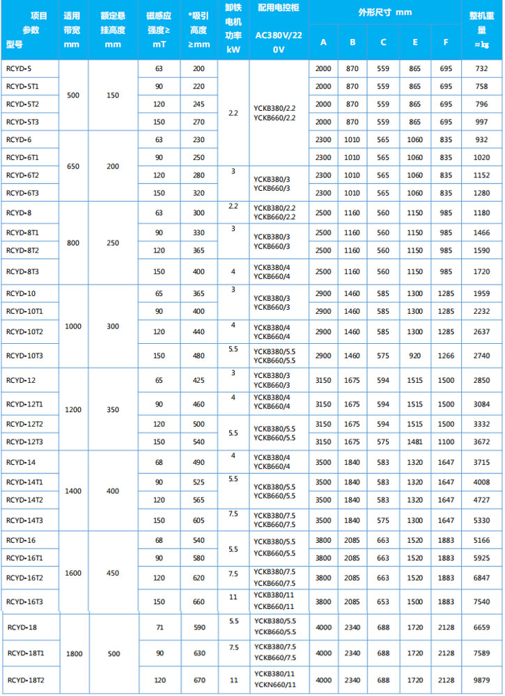 四、RCYD系列懸掛帶式永磁除鐵器主要技術(shù)參數(shù)、外形尺寸 執(zhí)行標(biāo)準(zhǔn):JB/T8711