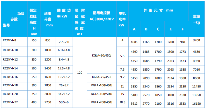 四、RCDY-J系列懸掛式組合回收型除鐵器主要技術參數(shù)、外形尺寸     執(zhí)行標準:JB/T7689、JB/T10885